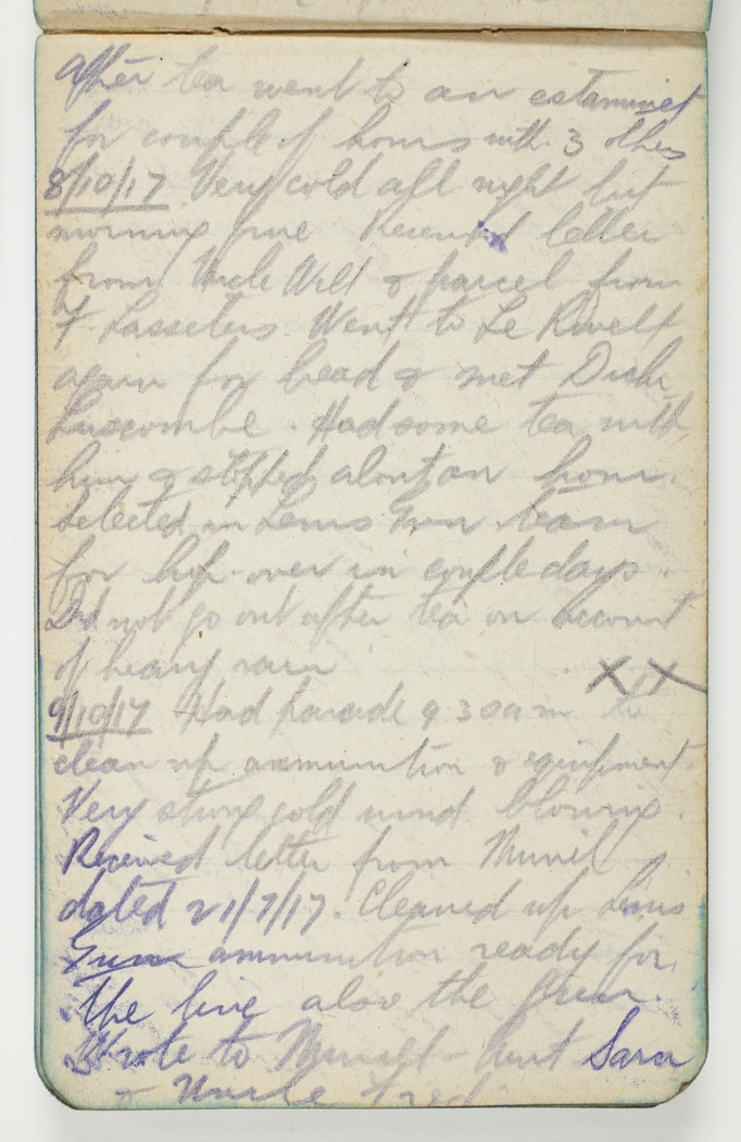 9/10/17 Had parade 9.30am to clean up ammunition & equipment. Very strong cold wind blowing. Received letter from Muriel dated 21/7/17. Cleaned up Lewis Gun ammunition ready for the live also the gun. Wrote to Muriel, Aunt Sara & Uncle Fred