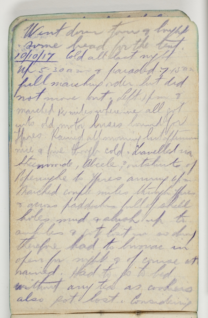10/10/17 Cold all last night. Up 5.30am & paraded 7.15am full marching order but did not move out. Left 1pm & marched 1½ miles where we all got into old motor buses bound for Ypres. Rained all morning but afternoon nice & fine though cold. Travelled via Steenwoorde, Abeele & outskirts of Poperinge to Ypres arriving 6pm. Marched couple miles through Ypres & across paddocks full of shell holes mud & slush up to ankles & got lost in so doing & therefore had to bivouac in open for the night & of course it rained. Had to go to bed without any tea as cookers also got lost. Considering