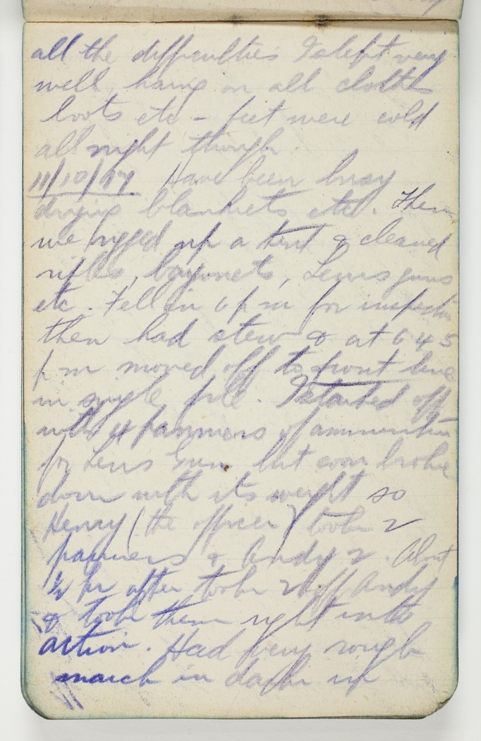 11/10/17 Have been busy drying blankets etc. Then we rigged up a tent & cleaned rifles, bayonets, Lewis guns etc. Fell in 6pm for inspection then had stew & at 6.45pm moved off to front line in single file. I started off with 4 panniers of ammunition for Lewis Gun but soon broke down with its weight so Henry (the officer) took 2 panniers & Andy 2. About ½ hr after took 2 off Andy & took them right into action. Had very rough march in dawn up