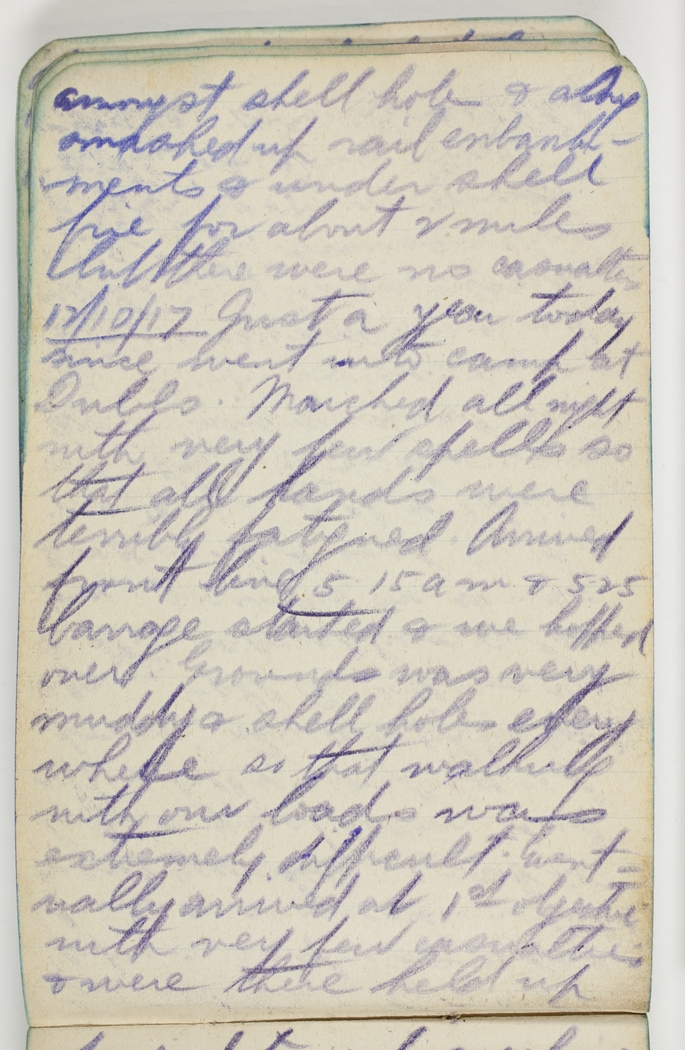 12/10/17 Just a year today since went into camp at Dubbo. Marched all night with very few spells so all hands were very fatigued. Arrived front line 5.15am & 5.25 barrage started & we hopped over. Ground was very muddy & shell holes everywhere so that walking with our load was extremely difficult. Eventually arrived at 1st objective with very few casualties & were there held up
