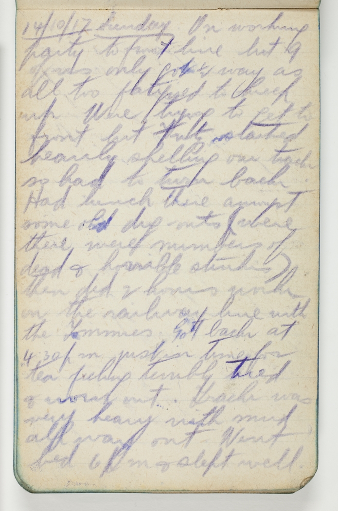 14/10/17 Sunday. On working party to front line but 9 of us only got ½ way as all too fatigued to keep up. Were trying to get to front but Fritz started heavily shelling our track so had to turn back. Had lunch there among some old dugouts (w[h]ere there were numbers of dead & horrible stinks) then did 2 hours work on the railway line with the Tommies. Got back at 4.30pm just in time for tea feeling terribly tired & worn out. Track was very heavy with mud all way out. Went bed 6pm & slept well.