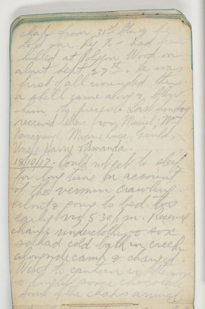 chap from 31st btn & he told me Reg N had been killed at Polygon Wood on about Sep 27th. He was first of all wounded then a shell came along & blew him to pieces. Last Sunday received letters from Muriel, Mrs Nancarrow, Minnie Lusc[ombe], Guild, Uncle Harry & Amanda.