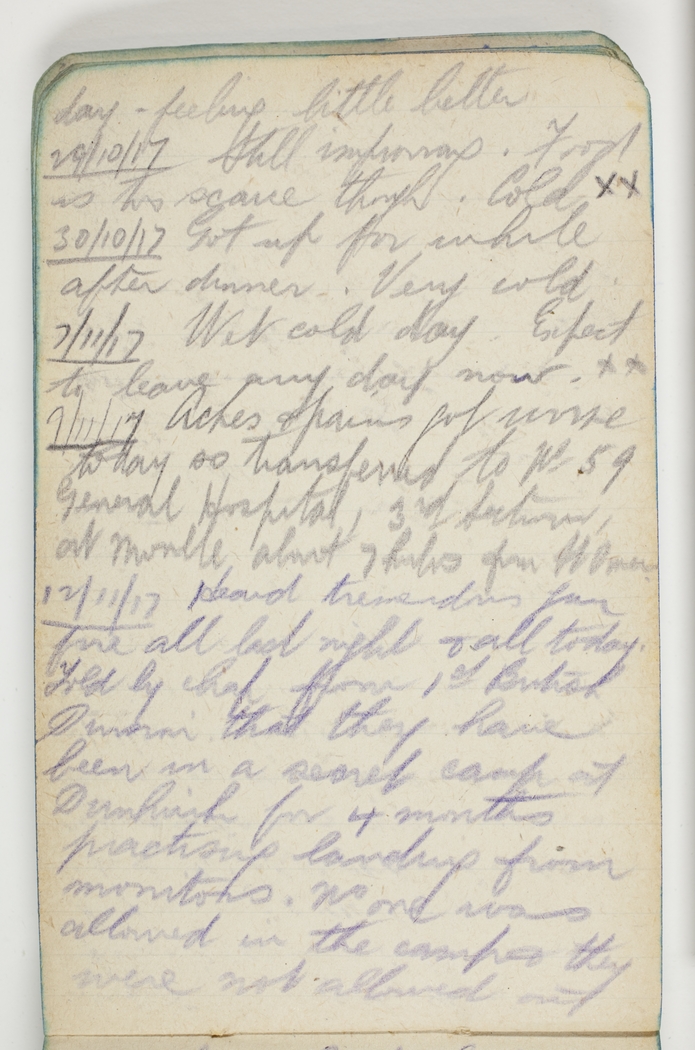 12/11/17 Heard tremendous gunfire all last night & all today. Told by chap from 1st British Division that they have been in a secret camp at Dunkirk for 4 months practising landing from monitors. No one was allowed in the camps and they were not allowed out