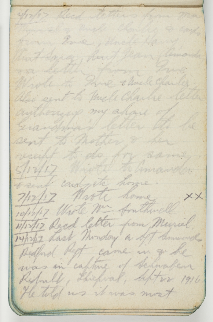 4/12/17 Received letters from Ma, Muriel & Uncle Charlie & cards from Ivie, Uncle Harry, Aunt Sara, Aunt Jean, Amanda & a letter from Ivie. Wrote to Ivie & Uncle Charles. Also sent to Uncle Charlie letter authorising my share of Grandma's letter to be sent to Mother & her receipt to do for same.