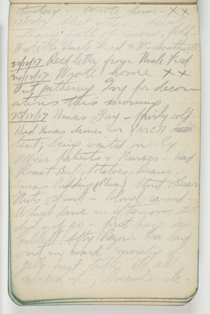 25/12/17 Xmas day – fairly cold. Had Xmas dinner in YMCA hall tent; being waited on by Officer patients & Nurses. Had Roast Beef, Potatoes, Beans, Xmas Pudding (Plum) Stout & Beer Nuts & Fruit – Colonel carved. Whist drive in afternoon but did not go – first prize was Gillett Sfty Razor. Tea laid out in ward consisting of jelly fruit trifle etc all mixed up, biscuits etc.