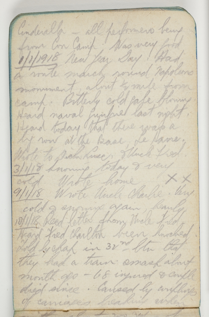 1/1/1918 New Year Day. Had a route march around Napoleon's monument, about ½ mile from camp. Bitterly cold gale blowing. Heard naval gunfire last night. Heard today that there was a big row at the Base, Le Havre. Wrote to Dick Lusc[ombe], & Uncle Fred.