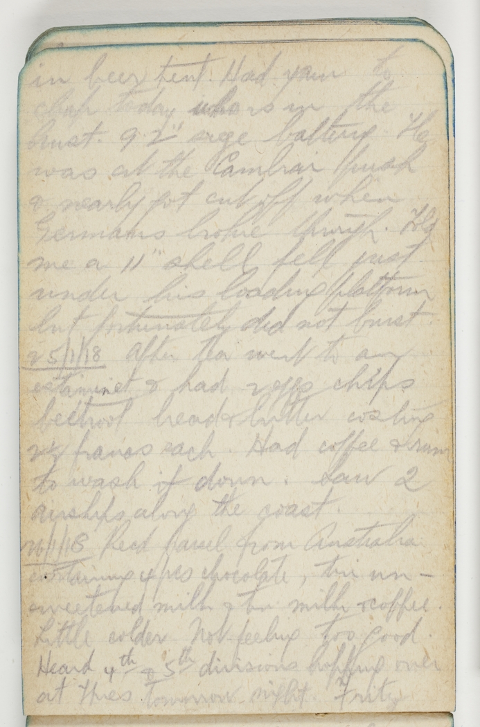 in beer tent. Had yarn to a chap today who is in the Aust. 9.2" siege battery. He was at the Cambrai push & nearly got cut off when the Germans broke through. Told me a 11" shell fell just under his loading platform but fortunately did not burst.