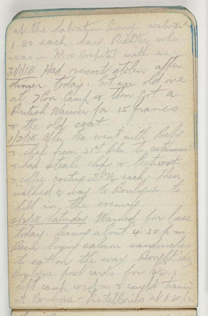 1/2/18 After tea went with Roelig & chap from 31st btn to estaminet & had steak chips & beetroot & coffee costing 2fr 2½ each. Then walked half way to Boulogne to fill in the evening.