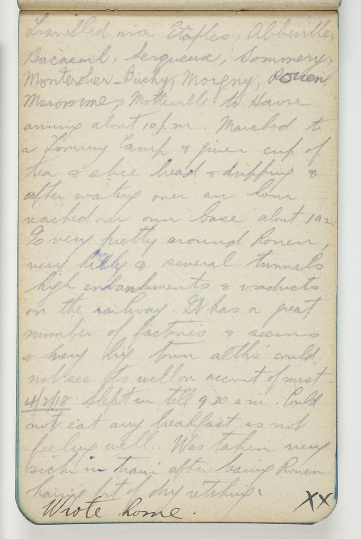 4/2/18 Slept in till 9.30am. Could not eat any breakfast as not feeling well. Was taken very sick in train after leaving Rouen having bit of dry retching. Wrote home.