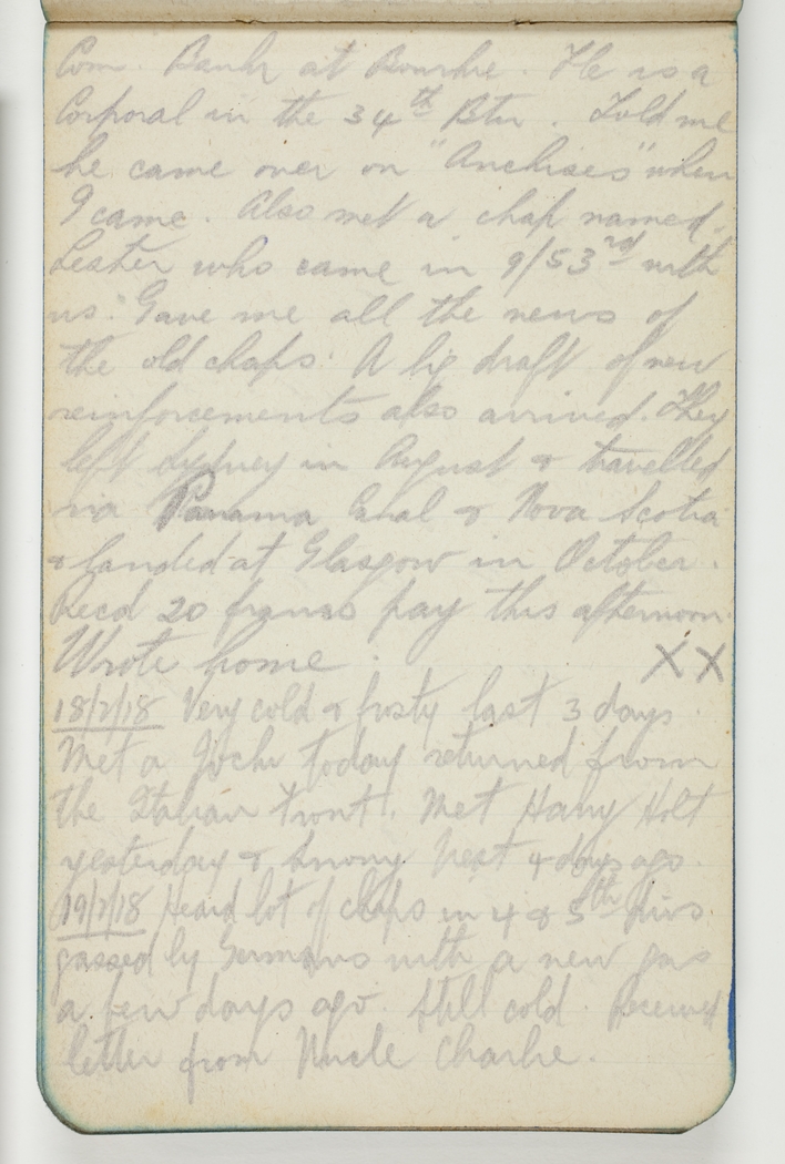 Com. Bank at Bourke. He is a Cpl in the 34th Btn. Told me he came over on"Anchises" when I came. Also met a chap named Lester who came in 9/53rd with us. Gave me all the news of the old chaps. A big draft of new reinforcements also arrived. They left Sydney in August & travelled via Panama Canal & Nova Scotia & landed at Glasgow in October. Recd 20 francs pay this afternoon. Wrote home.