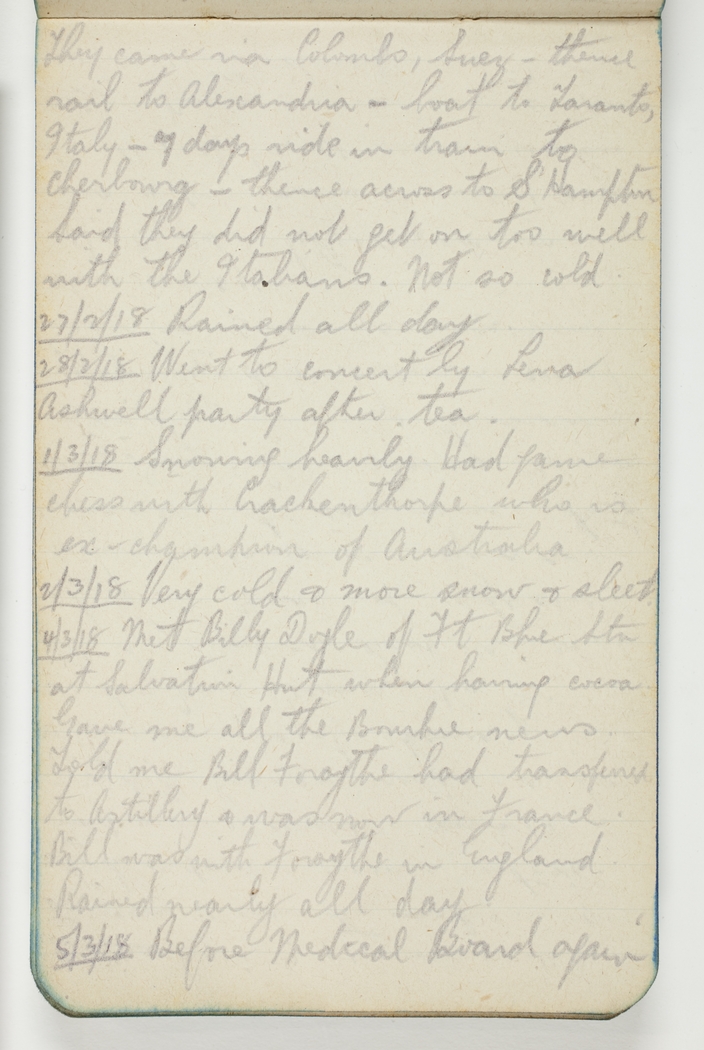 4/3/18 Met Billy Thorpe of Ft [Indecipherable] Stn at Salvation Hut when having cocoa. Gave me all the Bourke news. Told me Bill Forsythe had transferred to Artillery & was now in France. Bill was with Forsythe in England. Rained nearly all day.