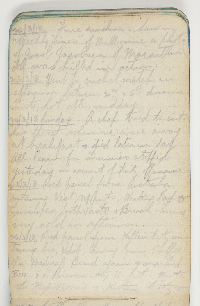 20/3/18 Fine sunshine. Saw in"Weekly Times" of Melbourne a photo of Jacob Jacobsen of Macarthur. He was killed in action.