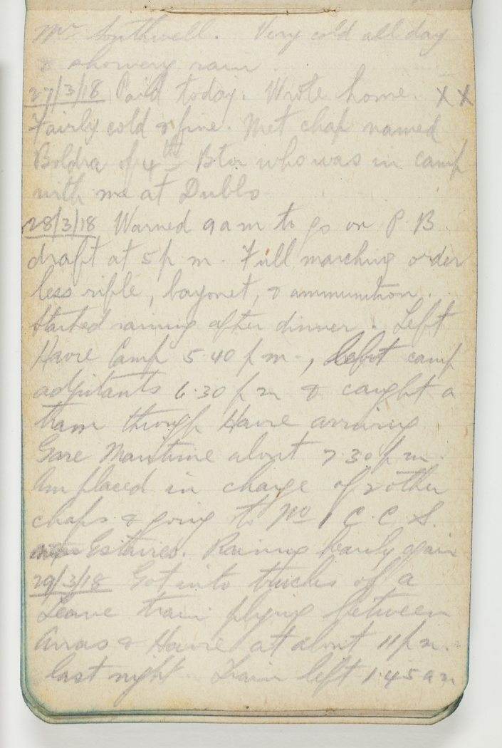 27/3/18 Paid today. Wrote home. Fairly cold & fine. Met a chap named Boldra of 4th btn who was in camp with me at Dubbo.