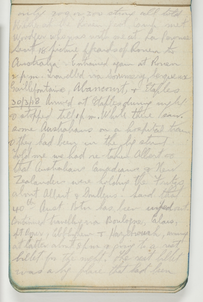 30/3/18 Arrived at Etaples during night & stopped till 1pm. While there saw some Australians on a hospital train & they had been in the big stunt. Told me we had retaken Albert & that Australians Canadians & New Zealanders were holding the Fritzs about Albert & Doullens. Said that 40th Aust Btn has been wiped out. Continued travelling via Boulogne, Calais, St Omer, Ebblinghem & Hazebrouck, arriving at latter about 8pm to a rest billet for the night. The rest billet was a big place that had been