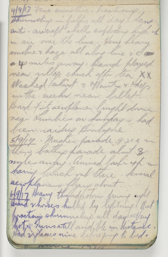 4/9/17 Fine sunshine. Practising skirmishing in fields all day. Saw anti-aircraft shells exploding high up in air over the line. Very heavy smoke & haze all along the line i.e 40 miles away. Band played near village church after tea XX washed shirt & u/pants & Hdcfs in the creek near billet. Heard Fritz aeroplane brought down near Lumbres on Sunday – had been raiding Boulogne.