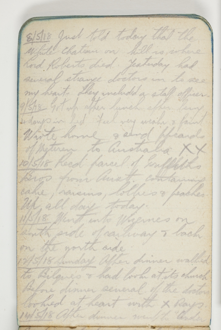 8/5/18 Just told today the White Chateau on hill is where Lord Roberts died. Yesterday had several strange doctors in to see my heart. They included a staff officer.