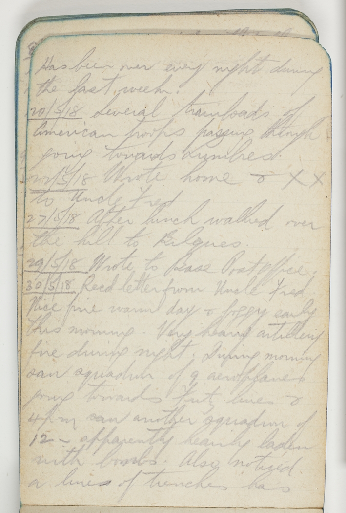 30/5/18 Recd letter from Uncle Fred. Nice fine warm day & foggy early this morning. Very heavy artillery fire during night. During morning saw squadron of 9 aeroplanes going towards Fritz lines & 4pm saw another squadron of 12 – apparently heavily laden with bombs. Also noticed a line of trenches has