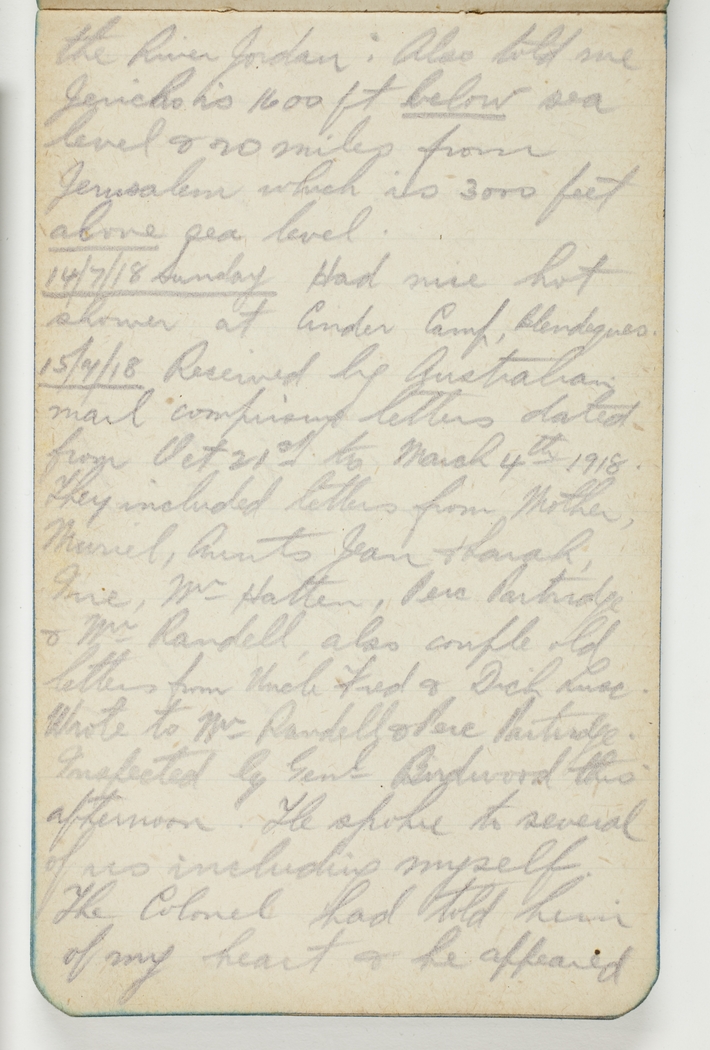 15/7/18 Received bid Australian mail comprising letters dated from Oct 21st to March 4th 1918. They included letters from Mother, Muriel, Aunts Jean & Sarah, Ivie, Mr Hatten, Perc Partridge & Mr Randell, also couple old letters from Uncle Fred & Dick Lusc[ombe]. Wrote to Mr Randell & Perc Partridge. Inspected by General Birdwood this afternoon. He spoke to several of us including myself. The Colonel had told him of my heart & he appeared