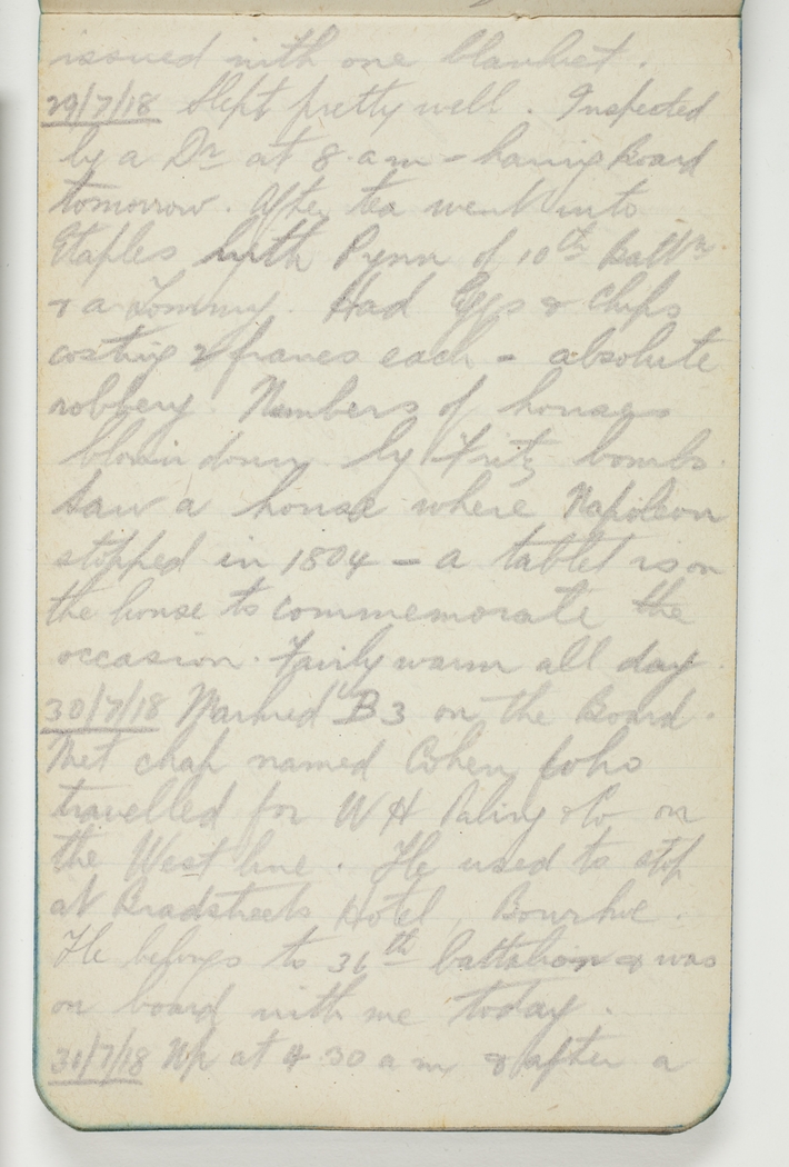 29/7/18 Slept pretty well. Inspected by Dr at 8am – having Board tomorrow. After tea went into Etaples with Pynn of 10th Batln & a Tommy. Had eggs & chips costing 2 francs each – absolute robbery. Numbers of houses blown down by Fritz bombs. Saw a house where Napoleon stopped in 1904 – a tablet is on the house to commemorate the occasion. Fairly warm all day.