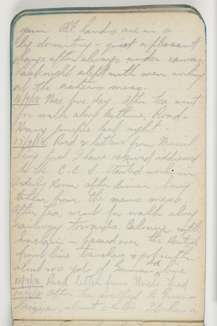 17/9/18 Recd 2 letters from Muriel, being first I have received addressed to the C.C.S. Started work in Orderly Room after dinner, being taken from the mens mess. After tea went for walk along railway towards Calonne with Sinclair – passed over the British front line trenches & got with 200 yds of German old line.