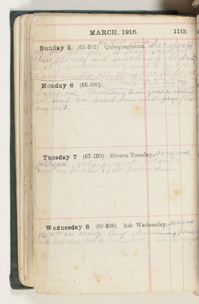 No Church parade Sarapeum [indecipheerable] on fatique to day. Windy and still cloudy and inclined to be dusty. The N. Z. who are camping next to us hear [indecipherable] they are going over the Canal camels trains [indecipherable]