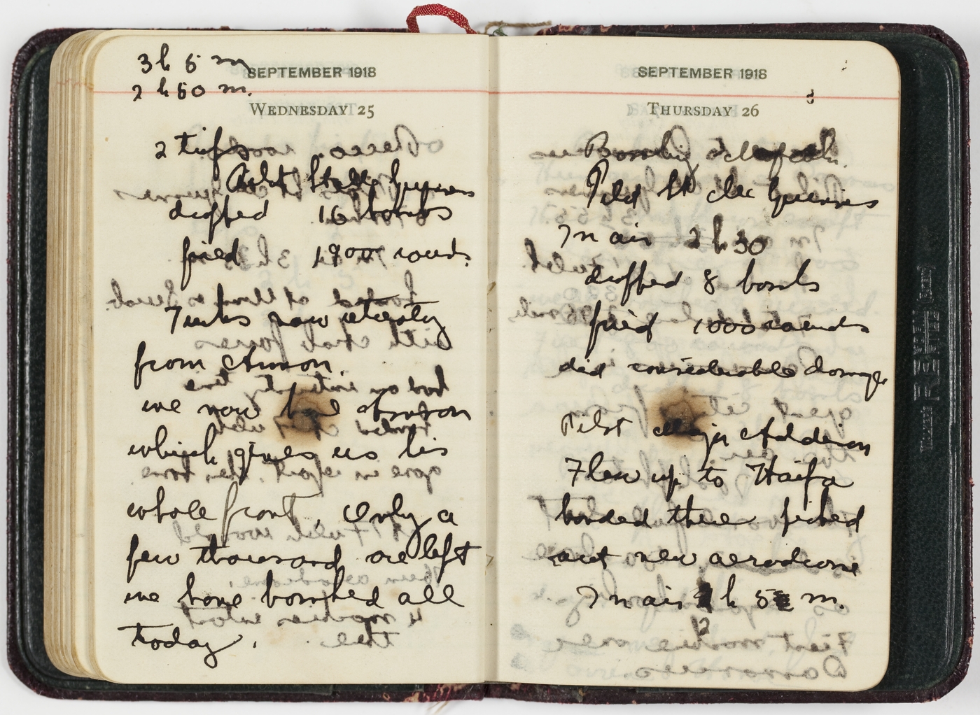 Bombing Mafrak. Pilot Lt. McGuinness. In air 2 h. 30, dropped 8 bombs, fired 1000 rounds, did considerable damage.