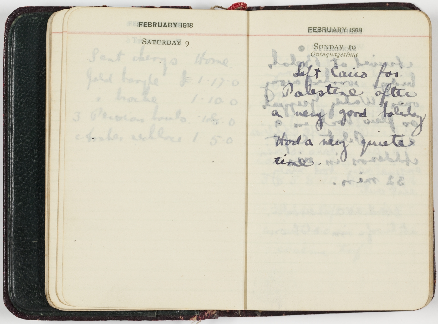 Left Cairo for Palestine after a very good holiday. Had a very quiet time.