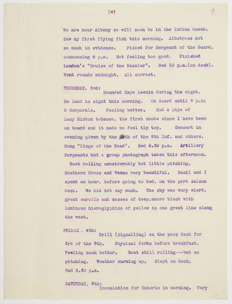 We are near Albany so will soon be in the Indian Ocean. Saw my first flying fish this morning. Albatross not so much in evidence. Picked for Sergeant of the Guard, commencing 6 p.m. Not feeling too good. Finished London's "Cruise of the Dazzler". Bed 10 p.m. (on deck). Went rounds midnight. All correct.