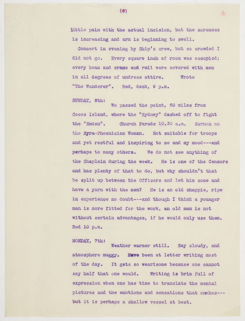 We passed the point, 60 miles from Cocos Island, where the "Sydney" dashed off to fight the "Emden". Church Parade 10.30 a.m. Sermon on the Syra-Phoenician Woman. Not suitable for troops and yet restful and inspiring to me and my mood---and perhaps to many others. We do not see anything of the Chaplain during the week. He is one of the Censors and has plenty of that to do, but why shouldn't that be split up between the Officers and let him come and have a yarn with the men? He is an old chappie, ripe in experience no doubt---and though I think a younger man is more fitted for the work, an old man is not without certain advantages, if he would only use them. Bed 10 p.m.