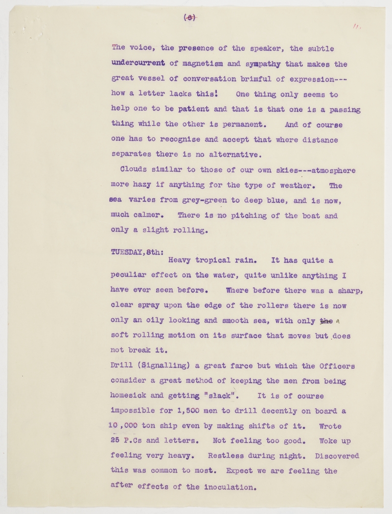 Drill (Signalling) a great farce but which the Officers consider a great method of keeping the men from being homesick and getting "slack". It is of course impossible for 1,500 men to drill decently on board a 10,000 ton ship even by making shifts of it. Wrote 25 P.Cs and letters. Not feeling too good. Woke up feeling very heavy. Restless during night. Discovered this was common to most. Expect we are feeling the after effects of the inoculation.