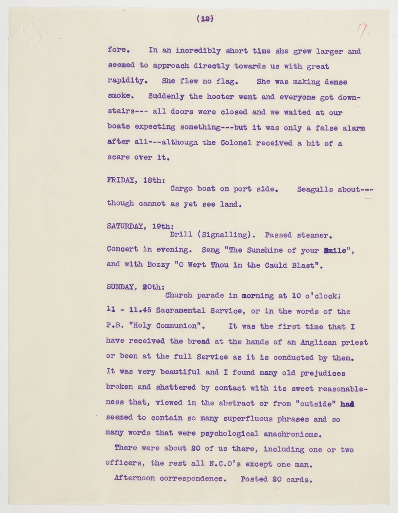 Church parade in morning at 10 o'clock; 11 – 11.45 Sacramental Service, or in the words of the P.B. "Holy Communion". It was the first time that I have received the bread at the hands of an Anglican priest or been at the full Service as it is conducted by them. It was very beautiful and I found many old prejudices broken and shattered by contact with its sweet reasonableness that, viewed in the abstract or from "outside" had seemed to contain so many superfluous phrases and so many words that were psychological anachronisms.