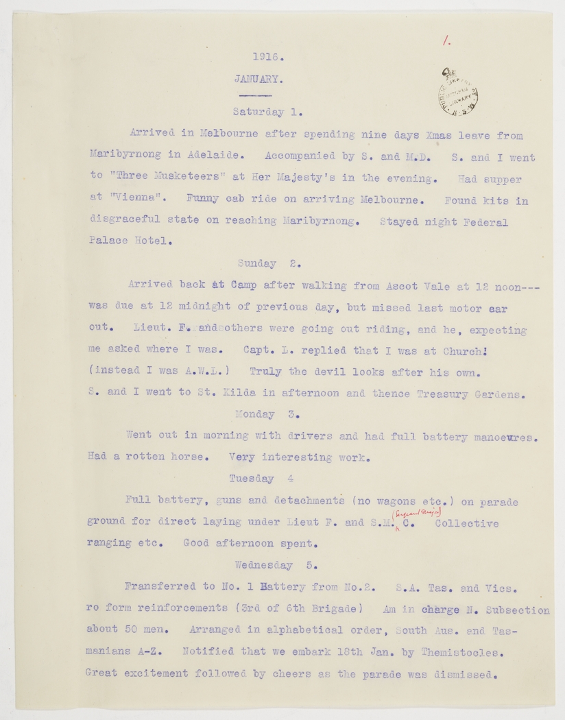 Arrived back at Camp after walking from Ascot Vale at 12 noon --- was due at 12 midnight of previous day, but missed last motor car out. Lieut. F. and others were going out riding, and he, expecting me asked where I was. Capt. L. replied that I was at Church! (instead I was A.W.L.) Truly the devil looks after his own. S. and I went to St. Kilda in afternoon and thence Treasury gardens.