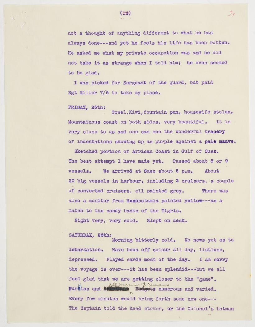 Sketched portion of African Coast in Gulf of Suez. The best attempt I have made yet. Passed about 8 or 9 vessels. We arrived at Suez about 5 p.m. About 20 big vessels in harbour, including 3 cruisers, a couple of converted cruisers, all painted grey. There was also a monitor from Mesopotamia painted yellow---as a match to the sandy banks of the Tigris.