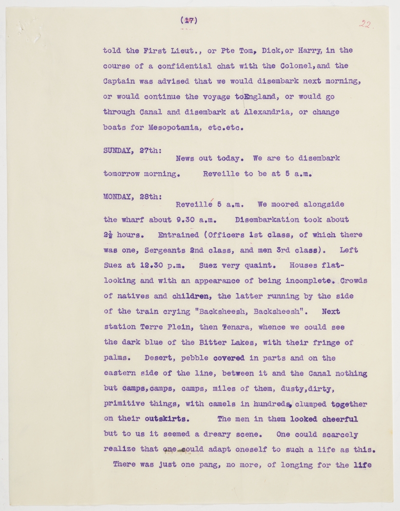 Reveillé 5 a.m. We moored alongside the wharf about 9.30 a.m. Disembarkation took about 2 ½ hours. Entrained (Officers 1st class, of which there was one, Sergeants 2nd class, and men 3rd class). Left Suez at 12.30 p.m. Suez very quaint. Houses flat-looking and with an appearance of being incomplete. Crowds of natives and children, the latter running by the side of the train crying "Backsheesh, Backsheesh". Next station Terre Plein, then Tenara, whence we could see the dark blue of the Bitter Lakes, with their fringe of palms. Desert, pebble covered in parts and on the eastern side of the line, between it and the Canal nothing but camps, camps, camps, miles of them, dusty, dirty, primitive things, with camels in hundreds, clumped together on their outskirts. The men in them looked cheerful but to us it seemed a dreary scene. One could scarcely realise that one could adapt oneself to such a life as this.