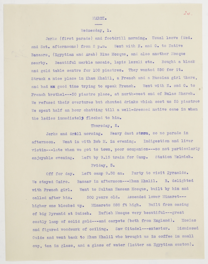 Jerks (first parade) and footdrill morning. Usual leave (Wed. and Sat. afternoons) from 2 p.m. Went with N. and G. to Native Bazaars, (Egyptian and Arab) Blue Mosque, and also another Mosque nearby. Beautiful marble mosaic, lapis lazuli etc. Bought a black and gold table centre for 100 piastres. They wanted 250 for it. Struck a nice place in Khan Khalil, a French and a Russian girl there, and had good time trying to speak French. Went with N. and G. to French brothel---50 piastre place, at north-west end of Bulac Shareh. We refused their overtures but shouted drinks which cost us 55 piastree We spent half an hour chatting till a well-dressed native came in when the ladies immediately flocked to him.