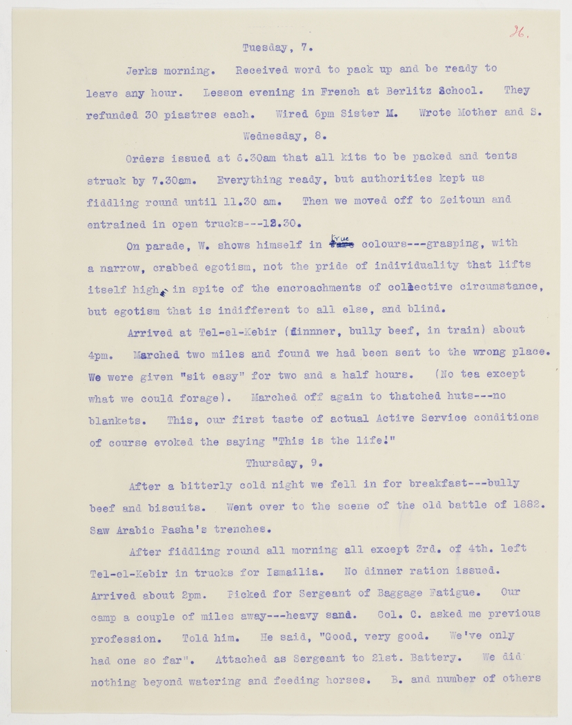 Arrived at Tel-el-Kebir (dinner, bully beef, in train) about 4pm. Marched two miles and found we had been sent to the wrong place. We were given "sit easy" for two and a half hours. (No tea except what we could forage). Marched off again to thatched huts---no blankets. This, our first taste of actual Active Service conditions of course evoked the saying "This is the life!"