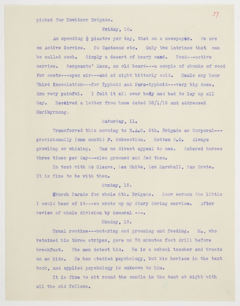 Am spending ½ piastre per day, that on a newspaper. We are on Active Service. No Canteens etc. Only two latrines that can be called such. Simply a desert of heavy sand. Food—active service. Sergeants' Mess, an old board---a couple of chunks of wood for seats---open air---and at night bitterly cold. Meals any hour Third inoculation---for Typhoid and Para-typhoid---very big dose. Arm very painful. I felt it all over body and had to lay up all day. Received a letter from home dated 28/1/16 and addressed Maribyrnong.