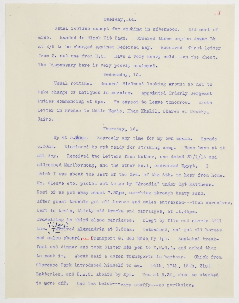 Usual routine. General Birdwood looking around so had to take charge of fatigues in morning. Appointed Orderly Sergeant Duties commencing at 6pm. We expect to leave tomorrow. Wrote letter in French to Molle Marie, Khan Khalil, Shareh el Mousky, Cairo.