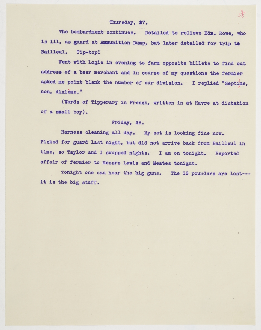 Went with Logie in evening to farm opposite billets to find out address of a beer merchant and in course of my questions the fermier asked me point blank the number of our division. I replied "Septième, non, dixième."