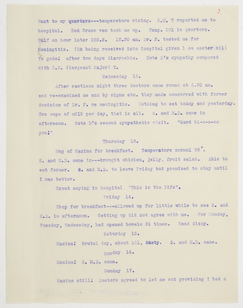 Went to my quarters---temperature rising. S.M. T reported me to hospital. Red Cross van took me up. Temp. 101 in quarters. Half an hour later 102.2 12.30 am. Dr. F. tested me for Meningitis. (On being received into Hospital given 1 oz caster oil) Ye gods! after two days diarroehia. Note D's sympathy compared with S.M. (Sergeant Major) T.