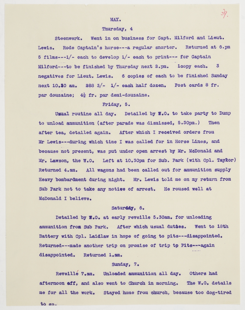 Steenwerk. Went in on business for Capt. Milford and Lieut. Lewis. Rode Captain's horse---a regular snorter. Returned at 6.pm 5 films---1/- each to develop 1/- each to print--- for Captain Milford---to be finished by Thursday next 2.pm. 1 copy each. 3 negatives for Lieut. Lewis. 6 copies of each to be finished Sunday next 10.30 am. 288 3/- 1/- each half dozen. Post cards 8 fr. par douzaine; 4 ½ fr. par demi-douzaine.