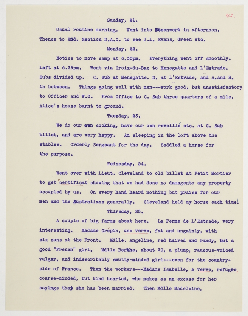 A couple of big farms about here. La Ferme de L'Estrade, very interesting. Madame Crépin, une verve, fat and ungainly, with six sons at the Front. Mdlle. Angeline, red haired and randy, but a good "French" girl, Mdlle Berthe, about 20, a plump, raucous-voiced vulgar, and indescribably smutty-minded girl---even for the countryside of France. Then the workers---Madame Isabelle, a verve, refugee, coarse-minded, but kind hearted, who makes as an excuse for her sayings that she has been married. Then Mdlle Madeleine,