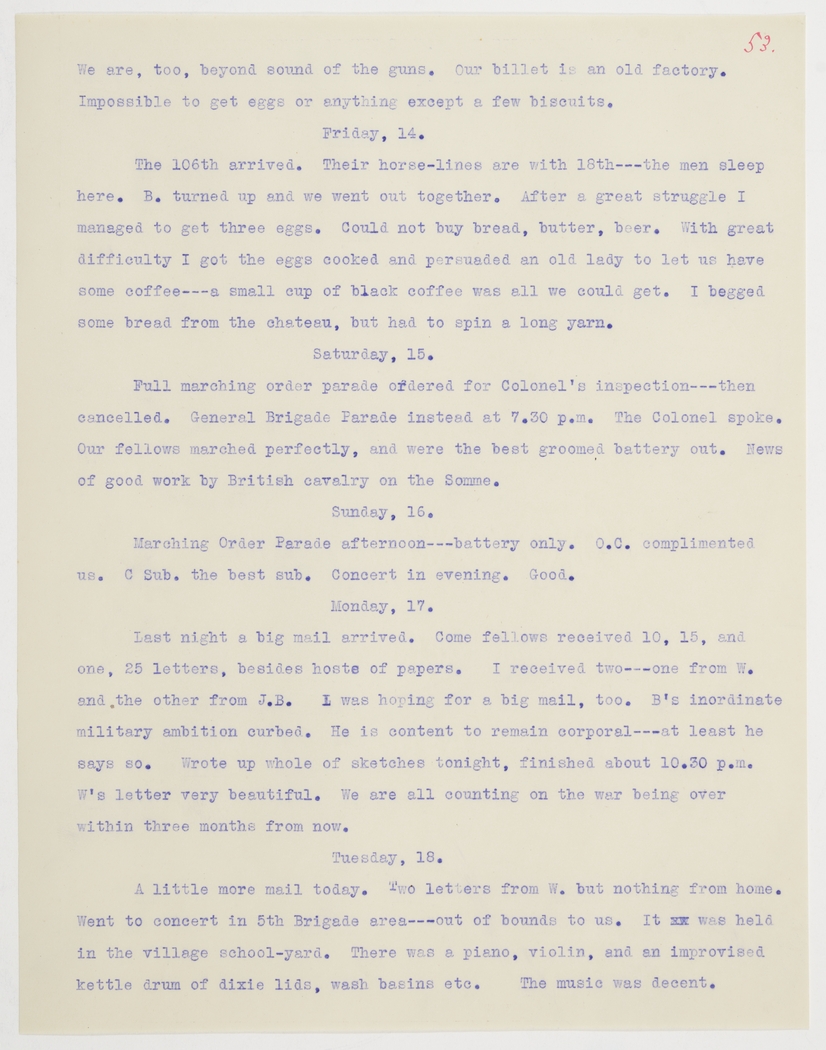 Last night a big mail arrived. Come fellows received 10, 15, and one, 25 letters, besides hosts of papers. I received two---one from W. and the other from J.B. I was hoping for a big mail, too. B's inordinate military ambition curbed. He is content to remain corporal---at least he says so. Wrote up whole of sketches tonight, finished about 10.30 p.m. W's letter very beautiful. We are all counting on the war being over within three months from now.