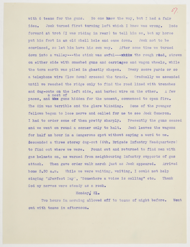 Presently the guns ceased and we went on round a corner only to halt. Jock leaves the wagons for half an hour in a dangerous spot without saying a word to me. Descended a three storey dug-out (6th Brigade Infantry Headquarters) to find out where we were. Found out and returned to find men with gas helmets on, as warned from neighbouring Infantry supports of gas attack. Then gave order walk march just as Jock appeared.