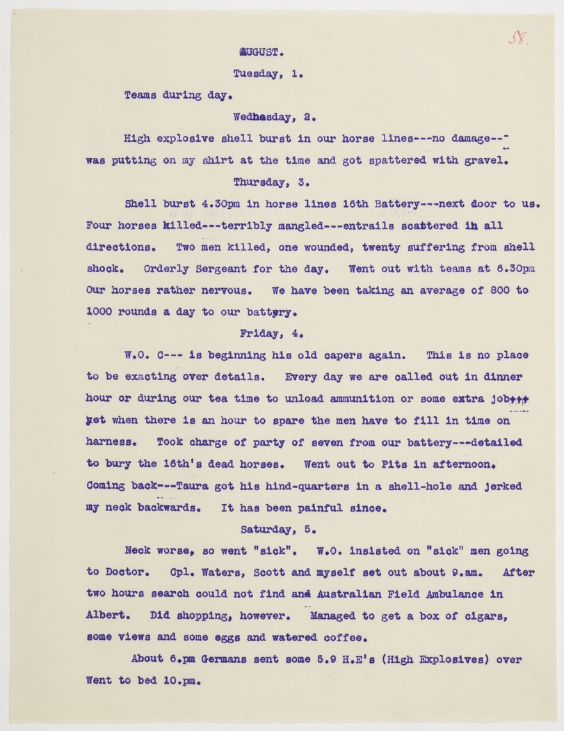 W.O. C--- is beginning his old capers again. This is no place to be exacting over details. Every day we are called out in dinner hour or during our tea time to unload ammunition or some extra job---yet when there is an hour to spare the men have to fill in time on harness. Took charge of party of seven from our battery---detailed to bury the 16th's dead horses. Went out to Pits in afternoon. Coming back---Taura got his hind-quarters in a shell-hole and jerked my neck backwards. It has been painful since.