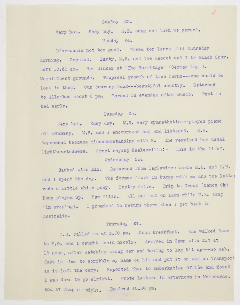 Very hot. Easy day. M.N. very sympathetic---played piano all evening. M.B. and I encouraged her and listened. M.B. depressed because misunderstanding with M. She regained her usual lightheardedness. Great saying Healesville: –"This is the life".
