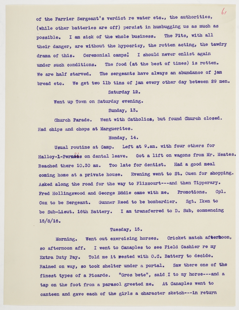 Usual routine at Camp. Left at 9.am. with four others for Halloy-l-Pernois on dental leave. Got a lift on wagons from Mr. Meates. Reached there 10.30 am. Too late for dentist. Had a good meal coming home at a private house. Evening went to St. Ouen for shopping. Asked along the road for the way to Flixcourt---and then Tipperary. Fred Hollingswood and George Eddie came with me. Promotions. Cpl. Cox to be Sergeant. Gunner Reed to be bombardier. Sgt. Iken to be Sub-Lieut. 16th Battery. I am transferred to D. Sub, commencing 15/8/16.