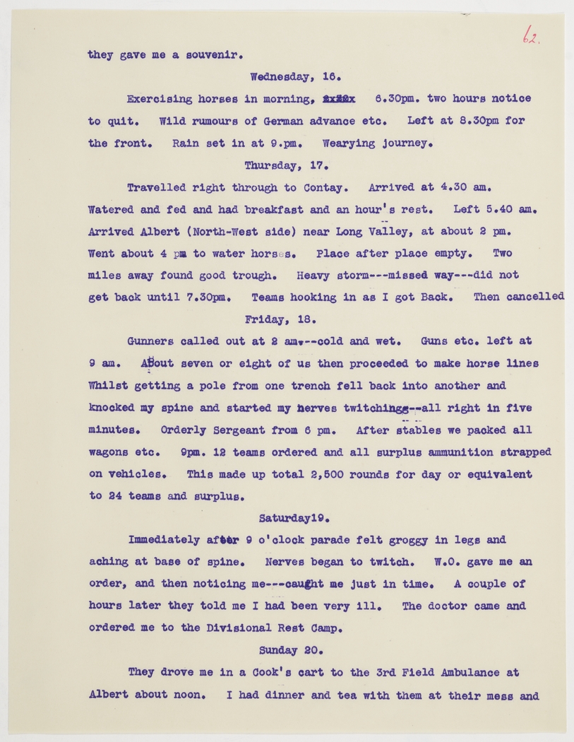 Immediately after 9 o'clock parade felt groggy in legs and aching at base of spine. Nerves began to twitch. W.O. gave me an order, and then noticing me---caught me just in time. A couple of hours later they told me I had been very ill. The doctor came and ordered me to the Divisional Rest Camp.