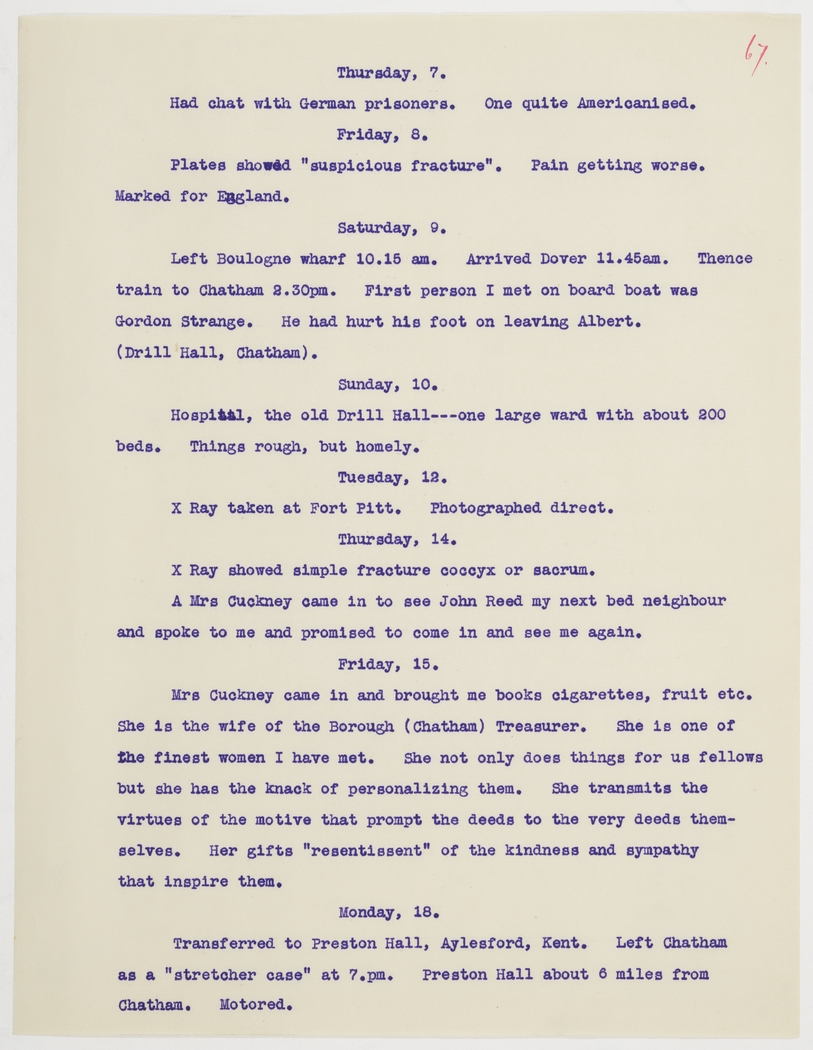 Mrs Cuckney came in and brought me books cigarettes, fruit etc. She is the wife of the Borough (Chatham) Treasurer. She is one of the finest women I have met. She not only does things for us fellows but she has the knack of personalizing them. She transmits the virtues of the motive that prompt the deeds to the very deeds themselves. Her gifts "resentissent" of the kindness and sympathy that inspire them.