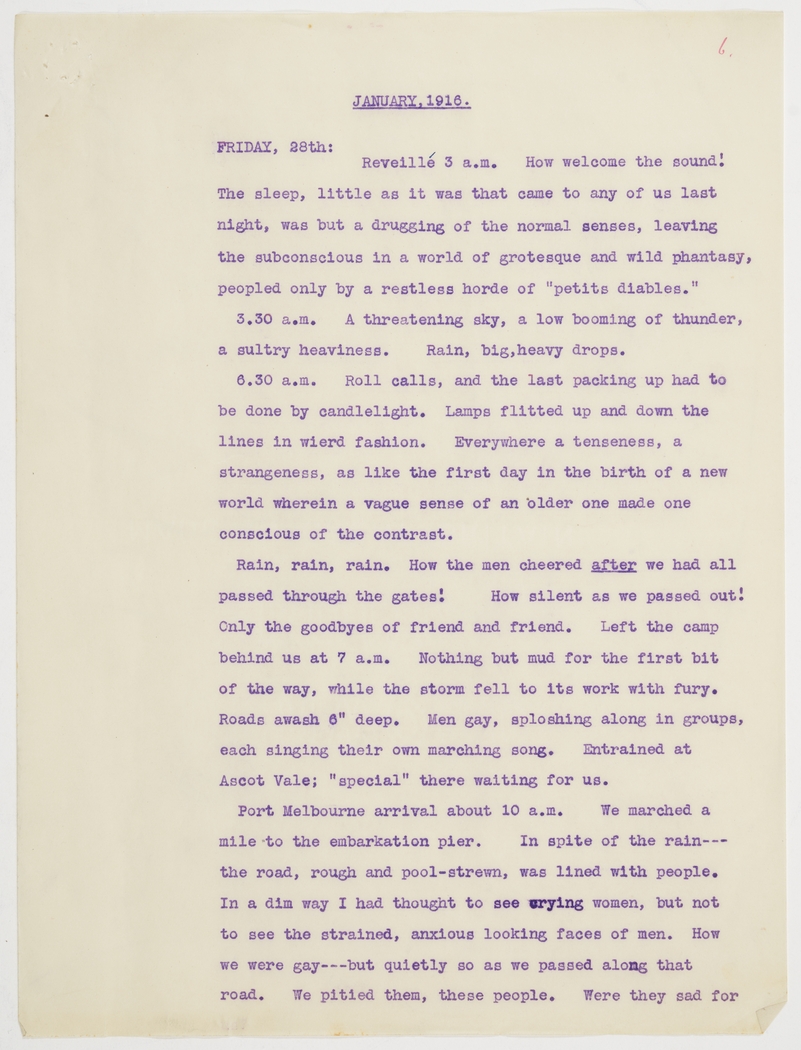 Port Melbourne arrival about 10 a.m. We marched a mile to the embarkation pier. In spite of the rain---the road, rough and pool-strewn, was lined with people. In a dim way I had thought to see crying women, but not to see the strained, anxious looking faces of men. How we were gay---but quietly so as we passed along that road. We pitied them, these people. Were they sad for